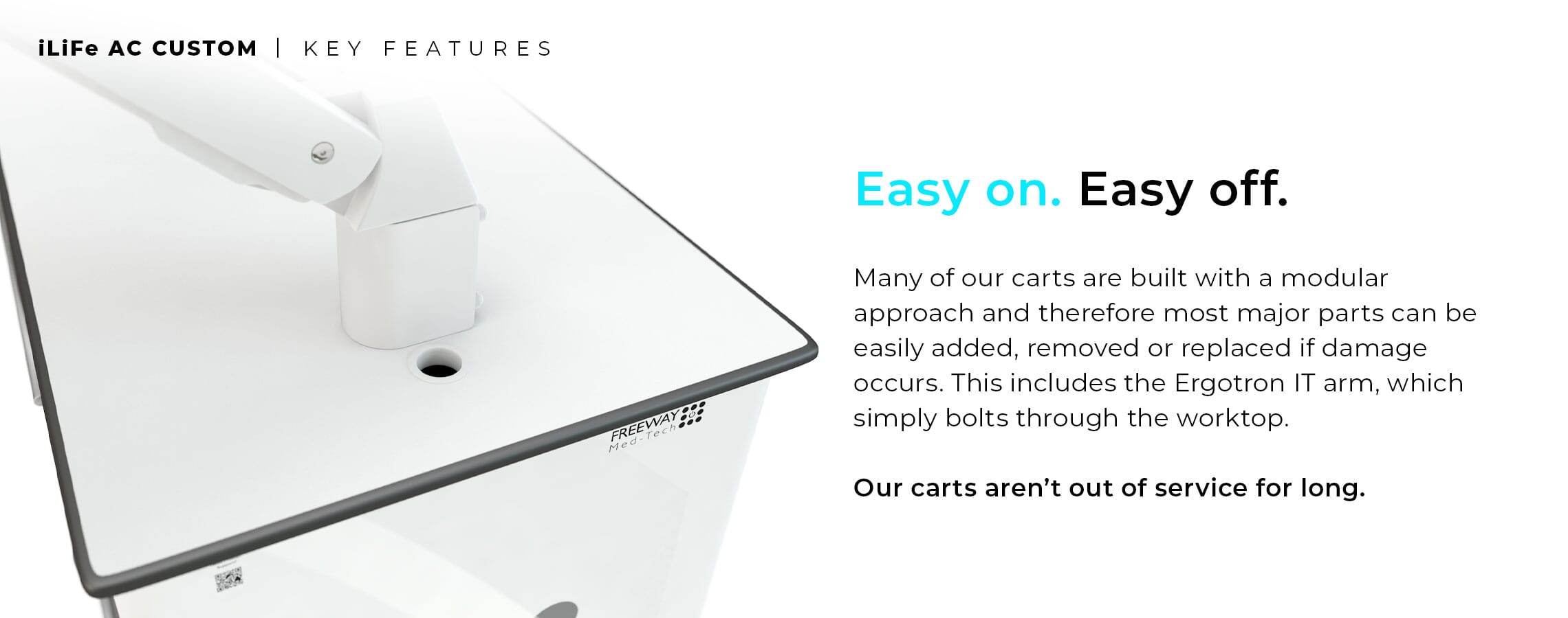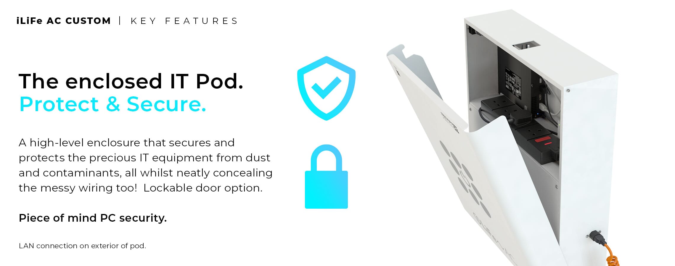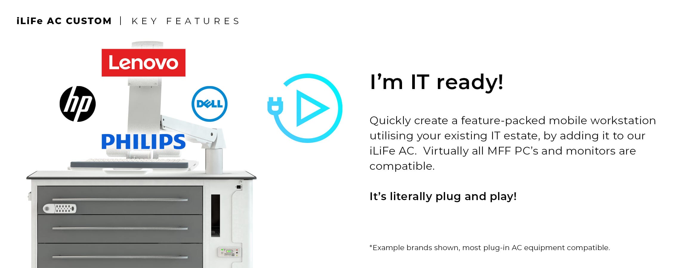 - FREEWAY IT POD - Fixed to the side of the cart and below the work surface, the IT Pod can accommodate a Micro Form Factor PC. The cables can then be routed neatly through the IT Pod, through the enclosed cable grommet in the work surface above, and fed to the optional adjustable monitor mount. This creates an adaptable storage area that can be modified to suit specific needs, as well as advancements in technology as time progresses. The IT Pod itself can be made secure using a standard Digi-Lock, but keyed options are also available. Power is introduced to the IT Pod via a fused & switched C13 socket fitted to the rear to allow for emergency break away, which then leads to a 4 gang socket to distribute power to the equipment within. RJ45 data connections can also be specified to allow network input into the IT equipment within. The IT Pod can be modified to suit specialist devices as well as a host of other options, get in touch with the team to find out more information.