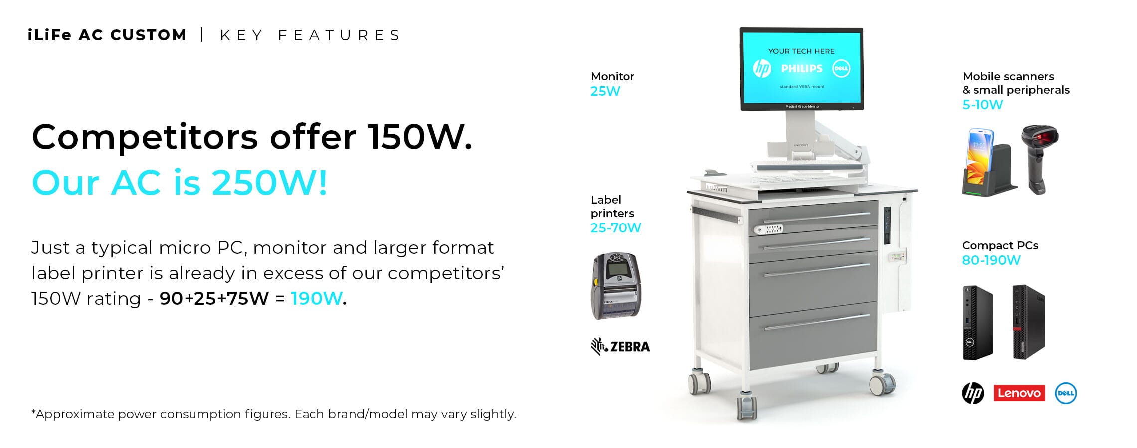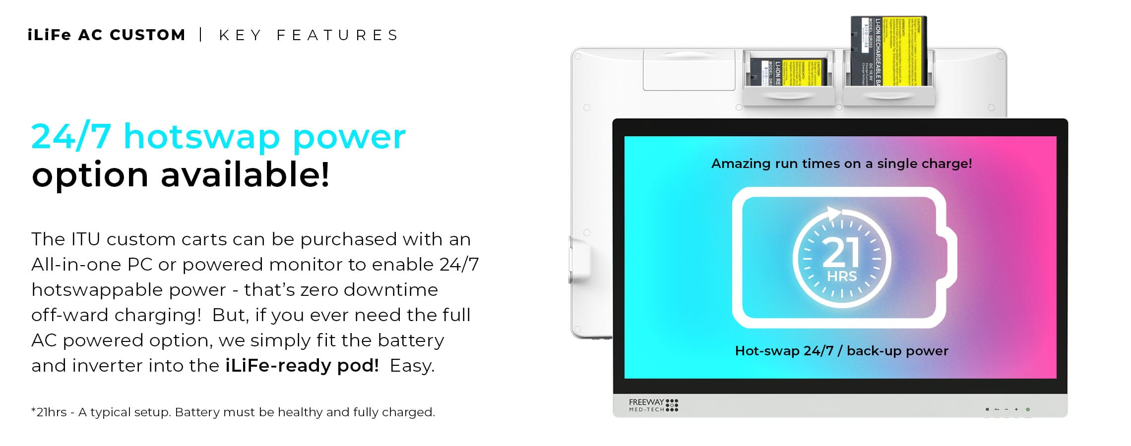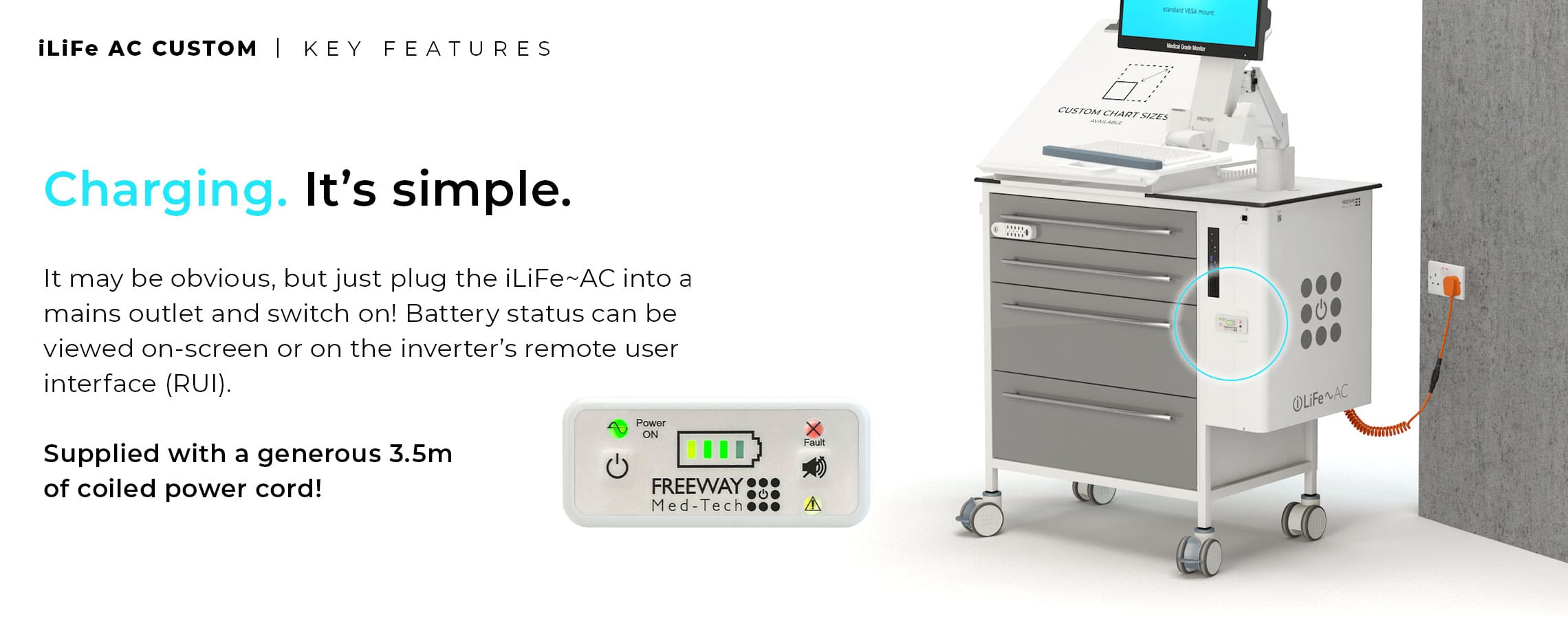 - FREEWAY IT POD - Fixed to the side of the cart and below the work surface, the IT Pod can accommodate a Micro Form Factor PC. The cables can then be routed neatly through the IT Pod, through the enclosed cable grommet in the work surface above, and fed to the optional adjustable monitor mount. This creates an adaptable storage area that can be modified to suit specific needs, as well as advancements in technology as time progresses. The IT Pod itself can be made secure using a standard Digi-Lock, but keyed options are also available. Power is introduced to the IT Pod via a fused & switched C13 socket fitted to the rear to allow for emergency break away, which then leads to a 4 gang socket to distribute power to the equipment within. RJ45 data connections can also be specified to allow network input into the IT equipment within. The IT Pod can be modified to suit specialist devices as well as a host of other options, get in touch with the team to find out more information.