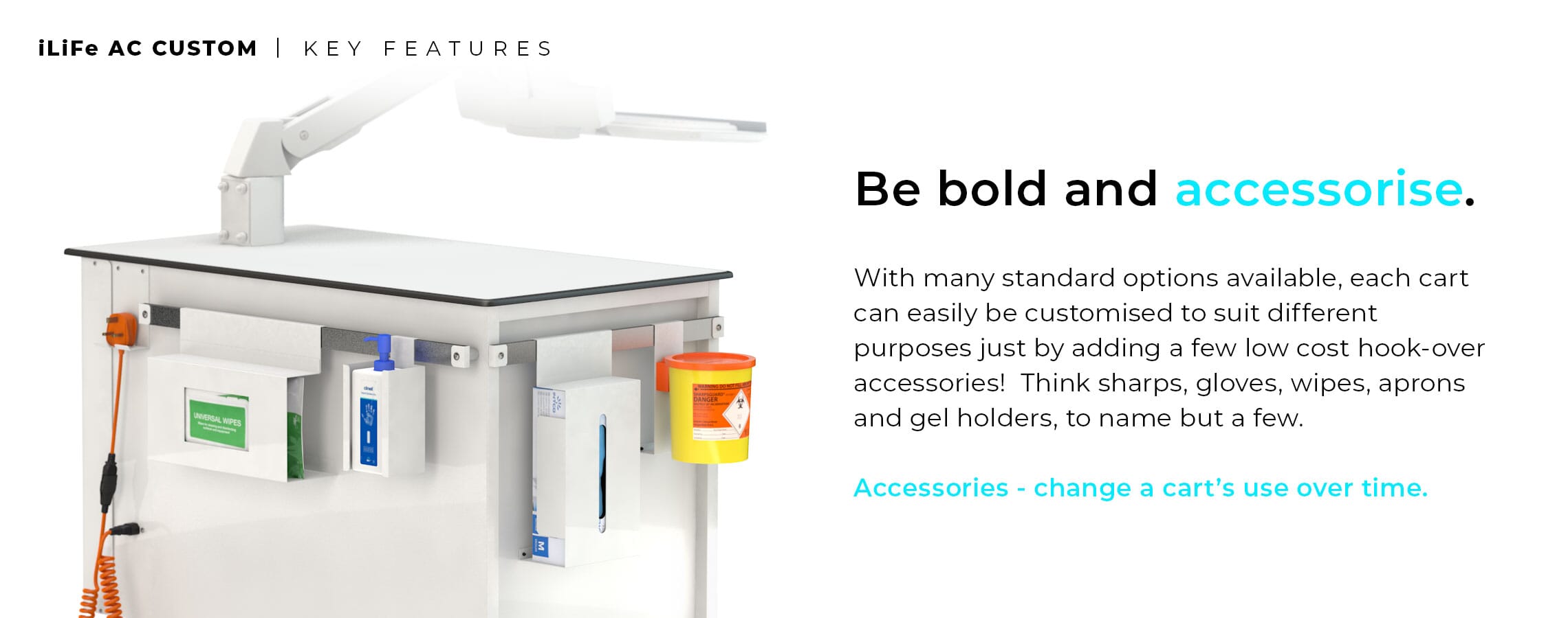 - 1 x length of ANODISED ALUMINIUM UNIVERSAL MEDICAL RAIL - Mounted on the left side of the Workstation which can accept a wide range of hook over accessories and existing equipment fitted with universal rail clamps.
