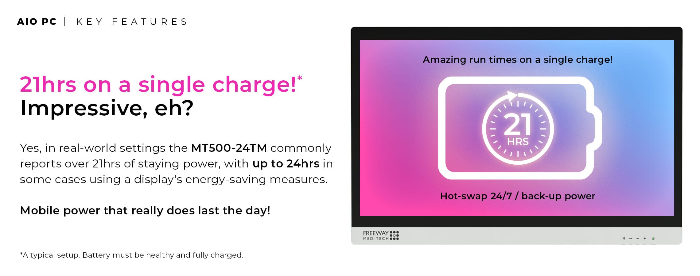 The NEW MT500-24TM is a Medical Grade Battery Powered All In One Monitor/PC, with a 24” 1920x1080 1080p capacitive touch screen display, a powerful Intel® Core™ Ultra 5 125U processor and hot-swappable batteries.