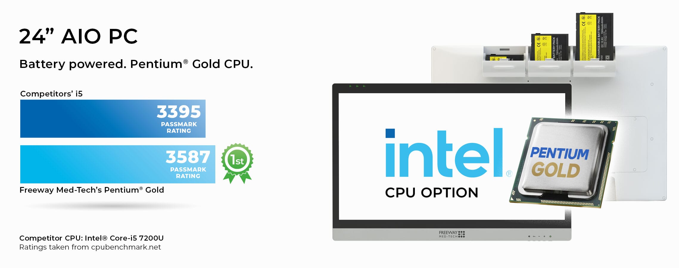 The MT500-24T is a Medical Grade Battery Powered All In One Monitor/PC, with a 24” 1920x1080 1080p capacitive touch screen display, a powerful Intel® Pentium® Gold processor and hot-swappable batteries.